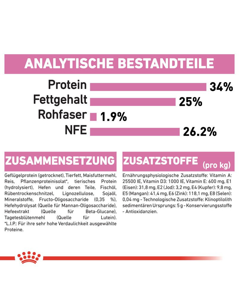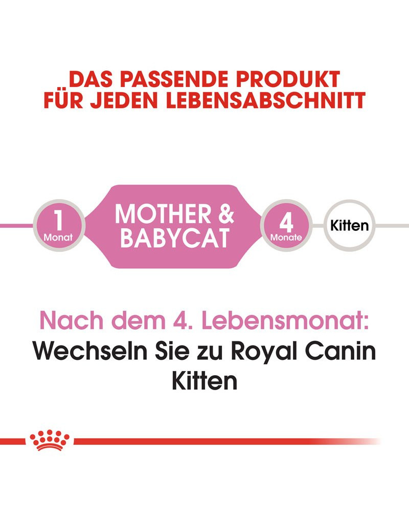 Drachtige katten of katten die recent een nest hebben gehad, hebben speciale behoeften op het gebied van voeding. Daarom is het belangrijk dat zij en hun kittens de juiste voedingsondersteuning krijgen om een langdurige gezondheid van de moeder en de best mogelijke start voor hun kittens te waarborgen. ROYAL CANIN Mother & Babycat is speciaal afgestemd op de voedingsbehoeften van de kattenmoeder en haar kittens. Het is geschikt voor drachtige of zogende katten en voor kittens van 1 tot 4 maanden oud in het eerste levensjaar.