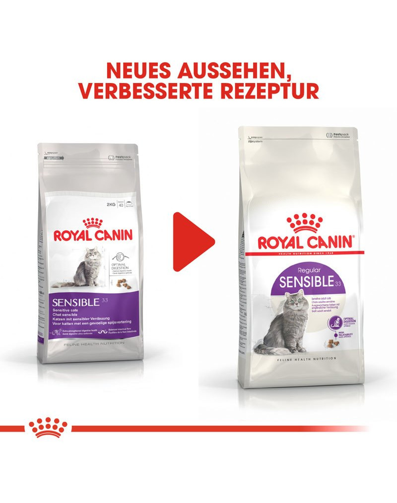 ROYAL CANIN Sensible 33 is ideaal voor katten van 1-7 jaar met een gevoelige spijsvertering. Het bevat een exclusieve combinatie van voedingsstoffen ter versterking en ondersteuning van een optimale spijsverteringsveiligheid.