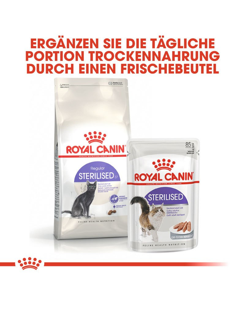 Om tegemoet te komen aan de individuele voorkeuren van verschillende katten, is ROYAL CANIN Sterilised 37 ook verkrijgbaar als stukjes in saus of gelei. Als u een gemengde voeding van droog- en natvoer overweegt, volg dan gewoon de voedingsrichtlijnen. Zo zorgt u ervoor dat uw kat de juiste hoeveelheid nat- en droogvoer krijgt.