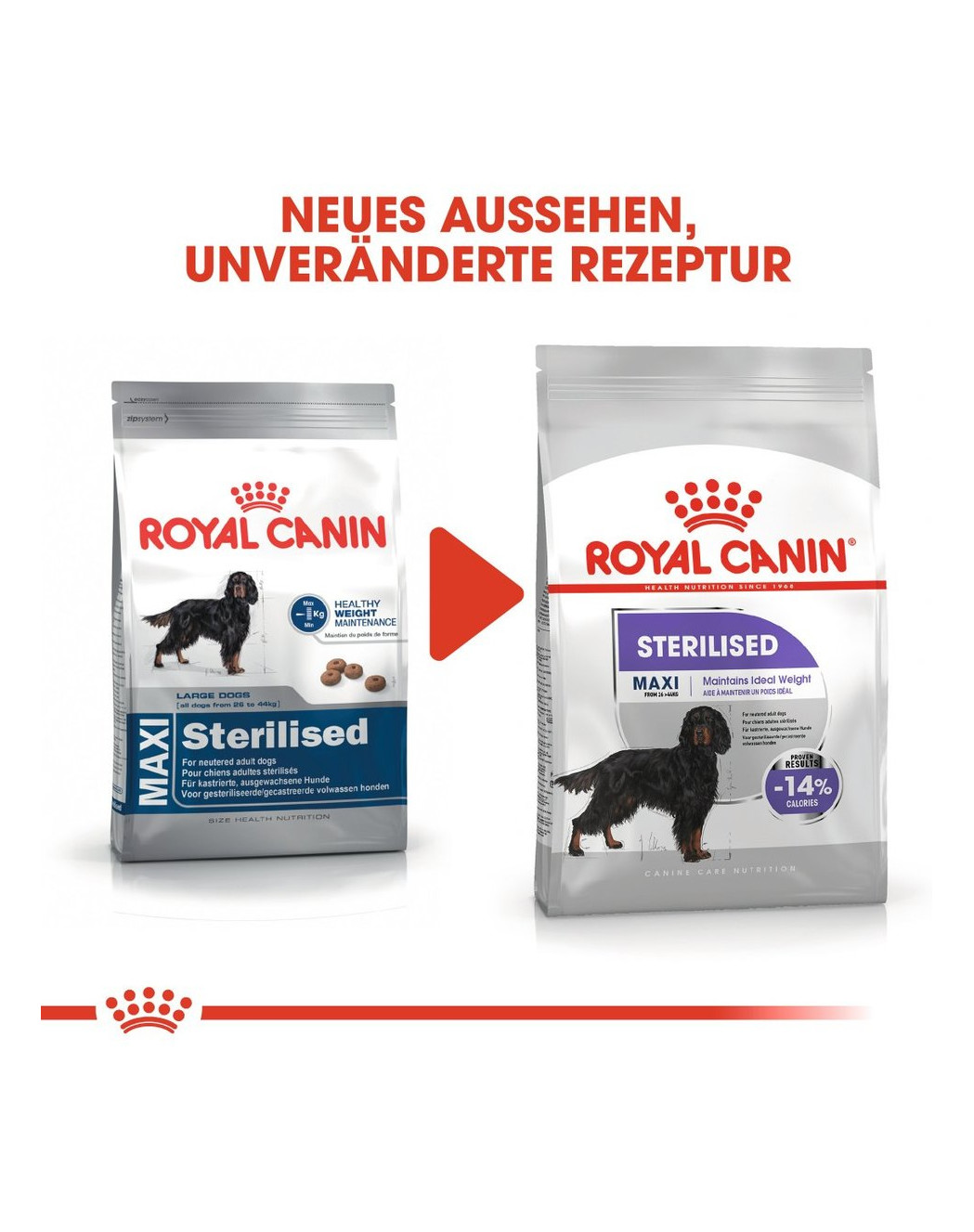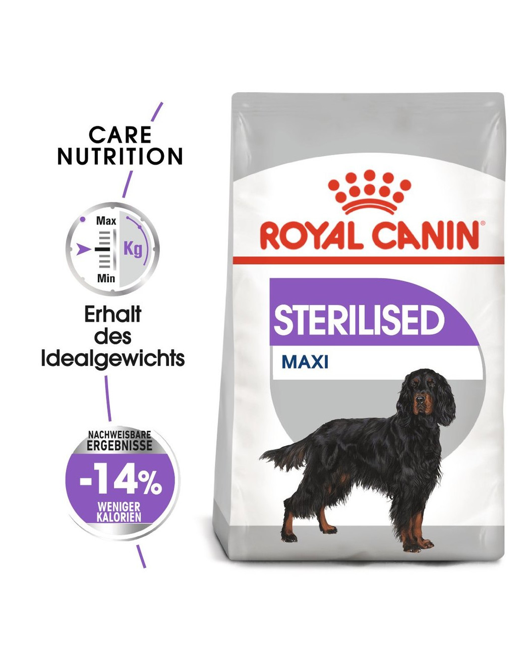 ROYAL CANIN® Sterilised Maxi is bewezen een succesvol voer te zijn om gewichtstoename te voorkomen: het bevat 14% minder calorieën dan conventioneel voer voor volwassen honden.