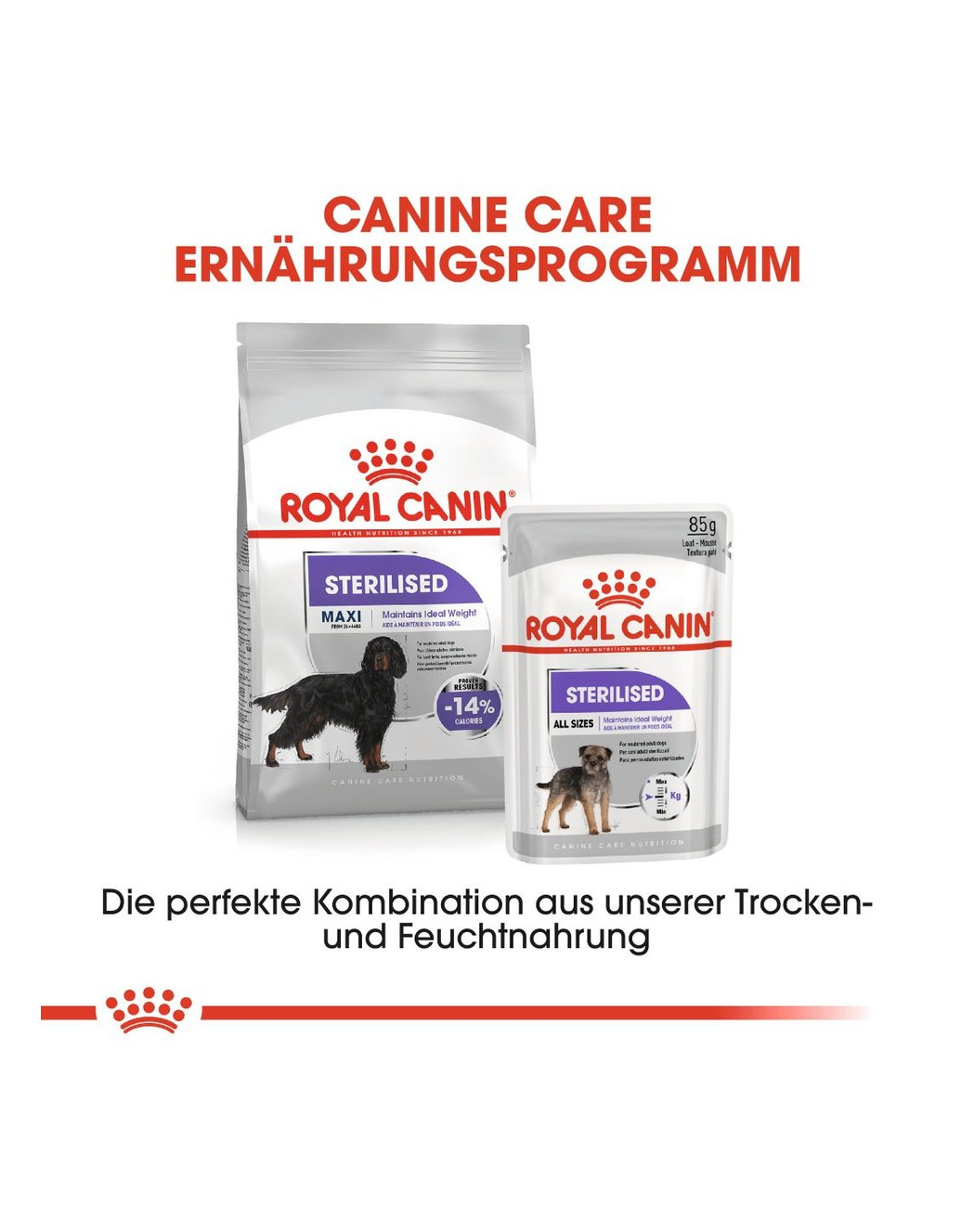 Ons Sterilised-voedingsprogramma is in twee varianten beschikbaar: als krokant droogvoer en als smakelijk natvoer in een verszak. Beide varianten zijn geschikt als volledige voeding, maar kunnen ook perfect met elkaar worden gecombineerd. U kunt natvoer en droogvoer in elke gewenste verhouding combineren.