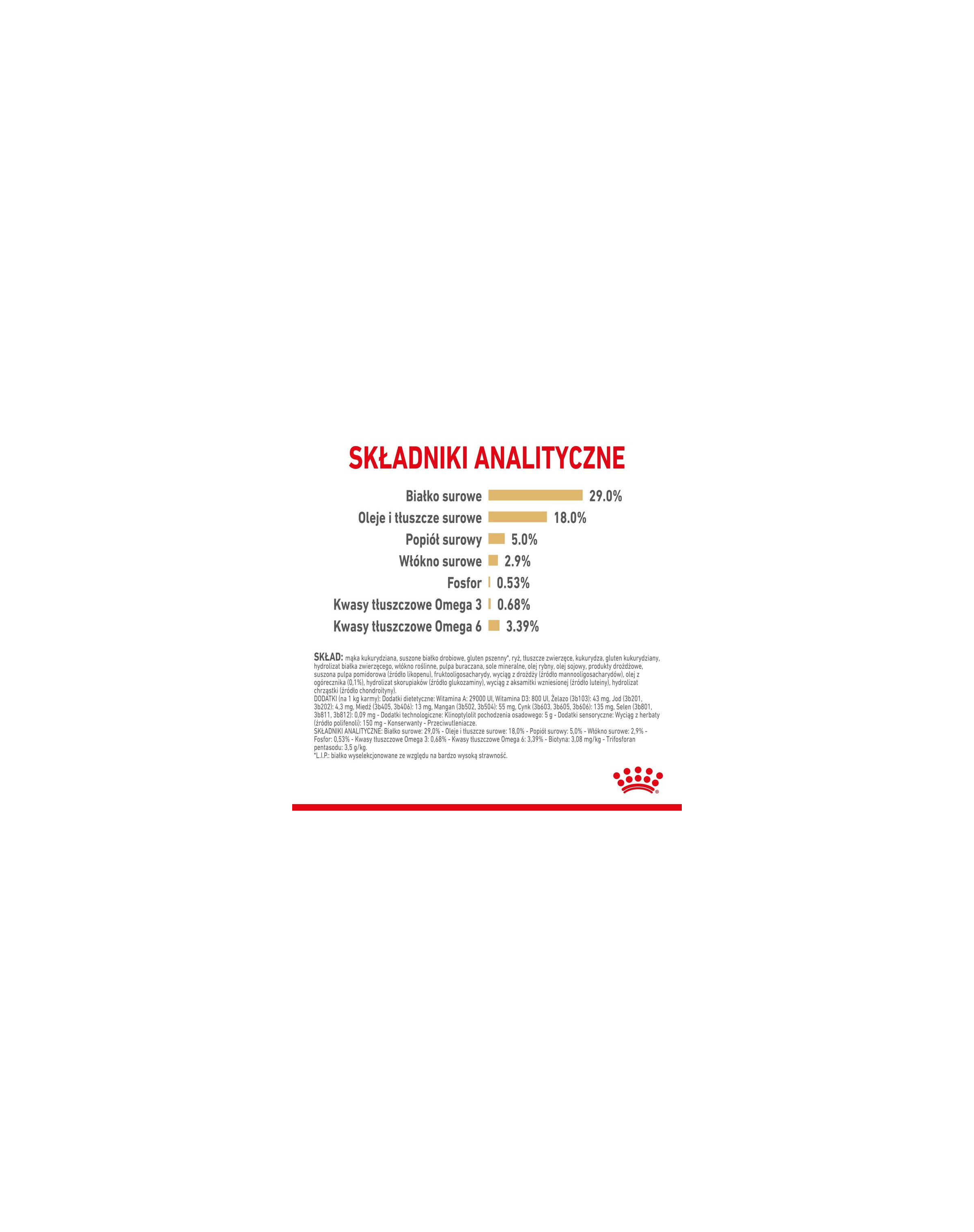 Protein: 29,0 % - Fettgehalt: 18,0 % - Rohasche: 5,0 % - Rohfaser: 2,9 % - Phosphor: 0,53 % - Omega 3-Fettsäuren: 0,68 % - Omega 6-Fettsäuren: 3,39 % - Biotin: 3,08 mg/kg - Pentanatriumtriphosphat: 3,5 g/kg.