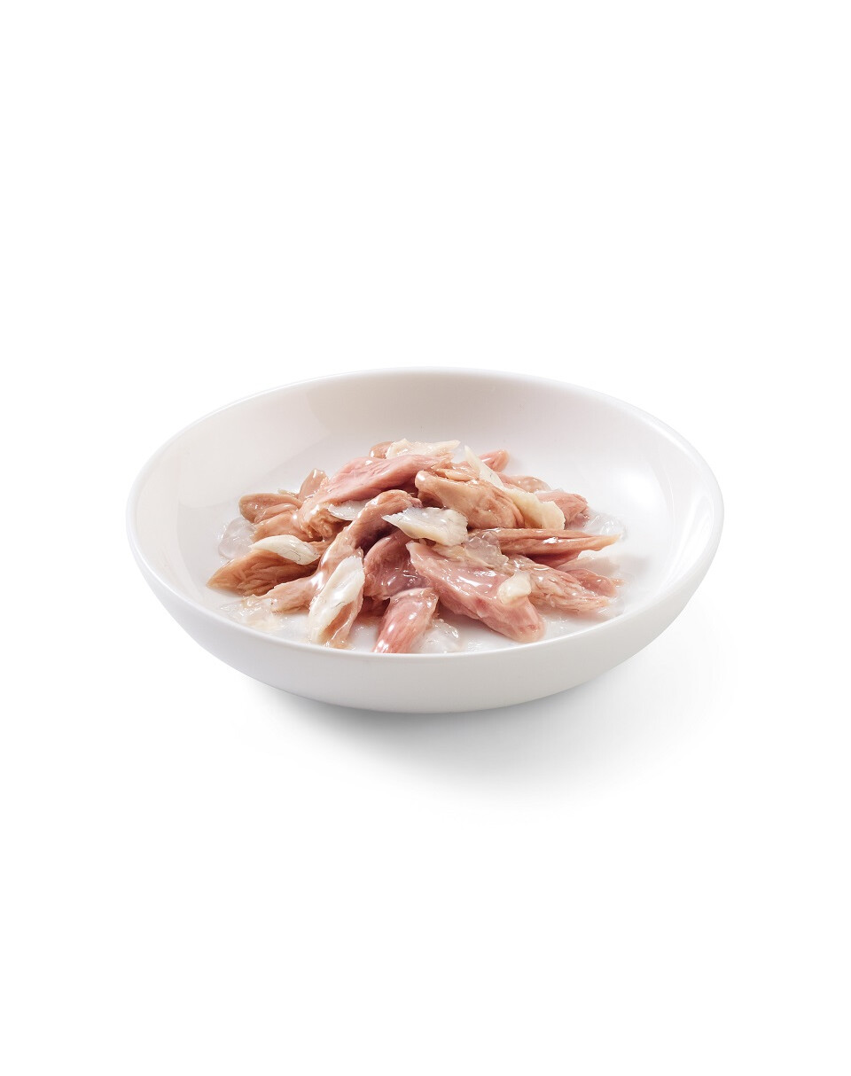 Samenstelling: Tonijn 55%, Kabeljauw 4%, Rijst 1,5% Analytische samenstelling: Eiwit 13%, Ruwe olie en vet 0,5%, Ruwe vezels 0,1%, Ruwe as 1%. Vochtgehalte 83%. Gewicht 50 g