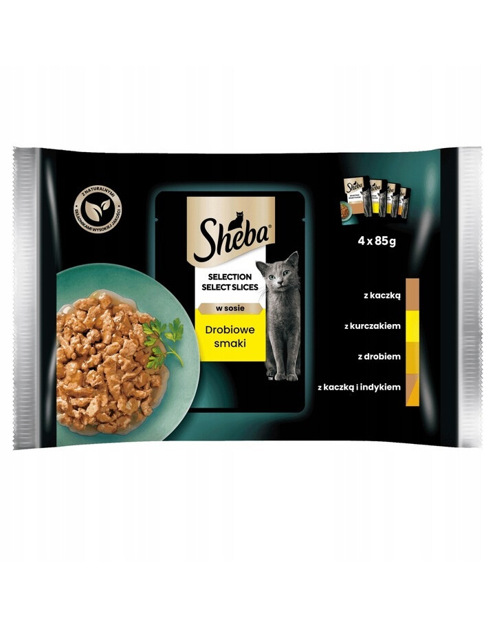 Sheba Select Poultry Flavours is een zorgvuldig geselecteerde mix van malse stukjes vlees gecombineerd met heerlijke sauzen. De maaltijden zijn verkrijgbaar in vier smaken, waaronder: Eend, Kip, Gevogelte, Eend en Kalkoen, om de smaakpapillen van zelfs de meest kieskeurige katten te bevredigen.