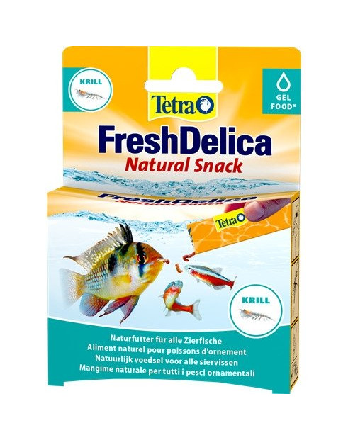 Het Tetra FreshDelica Gelfutter is de perfecte traktatie voor tussendoor en zorgt voor veel interactie en voerplezier met de vissen. Het voedingsrijke gelei is enerzijds geschikt als gezond en voedingsrijk natuurvoer voor alle siervissen en anderzijds biedt het een geheel nieuwe manier van interactie met de vissen: Door de handzame tubes en sachets kan het gel praktisch en gericht gedoseerd worden en geeft het voer door de wormachtige uitstraling in het water een natuurlijke indruk. De natuurlijke smaken van vier soorten verschillende micro-organismen (rode muggenlarven, garnaaltjes, krill en daphnia) worden goed geaccepteerd door de vissen en graag gegeten. Tetra FreshDelica is er in twee verschillende portiegroottes: Het drie gram sachet is geschikt voor alle aquarianen die hun vissen af en toe een beetje willen verwennen. De grote 80 gram tube daarentegen stelt aquarianen in staat om zich veel en intensief met de vissen bezig te houden, zonder dat het gelfutter te snel op is. De steriele en kiemvrije verpakking zorgt er bovendien voor dat het voer lang vers blijft. Tetra FreshDelica is ook zonder koeling drie jaar houdbaar en optimaal als aanvullend voer bij het hoofdvoer TetraMin.