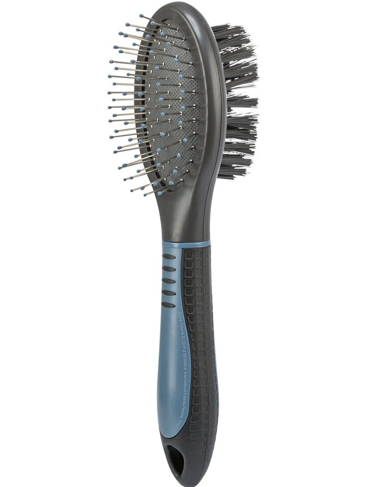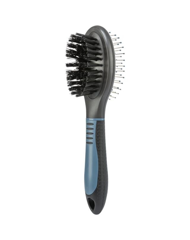 De dubbele borstel is het perfecte hulpmiddel voor de vachtverzorging van uw hond. De nylon en draadborstels met kunststof punten zorgen voor een zachte en effectieve borstelbeurt. Het kunststof handvat met rubberen grip garandeert een veilige grip tijdens het gebruik. Dankzij de vacht en de ondervacht geeft deze borstel de vacht volume en soepelheid.