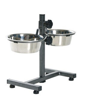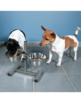 Twee schalen op een stabiele standaard. Schalen van roestvrij staal, 2x1800 ml. Hoogte verstelbaar tot 40 cm.