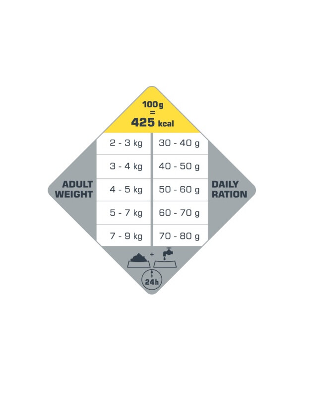 Een gezonde darmflora is de basis voor een goede spijsvertering. Licht verteerbare ingrediënten en het extra gehalte aan vezels en prebiotica (FOS 0,3%, MOS (0,1%) ondersteunen de darmflora optimaal.