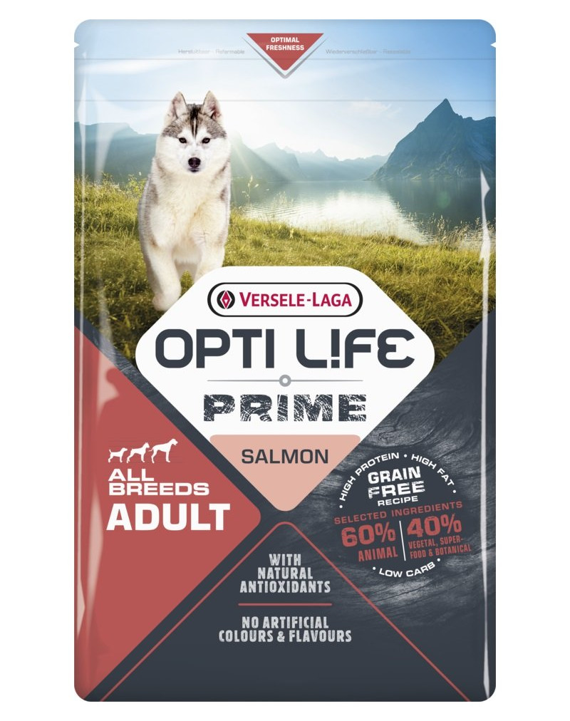 Met Opti Life Prime Adult Salmon geeft u uw hond een bijzonder rijke en smakelijke premium maaltijd, boordevol hoogwaardige voedingsstoffen. Onze graanvrije formule is rijk aan eiwitten en vetten en arm aan koolhydraten, met de ideale mix van de hoogwaardigste, smakelijkste en natuurlijkste ingrediënten, voor een dag vol avontuur.