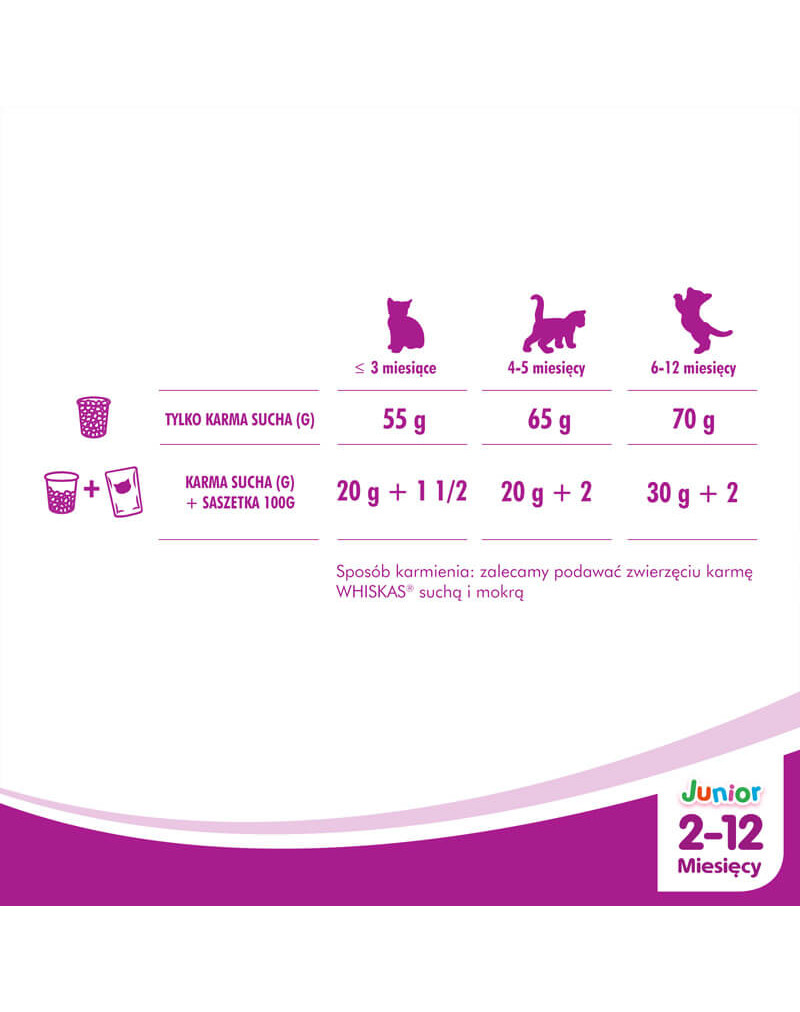 Whiskas Junior Huhn is een droog-alleenvoer voor opgroeiende kittens tot 12 maanden.