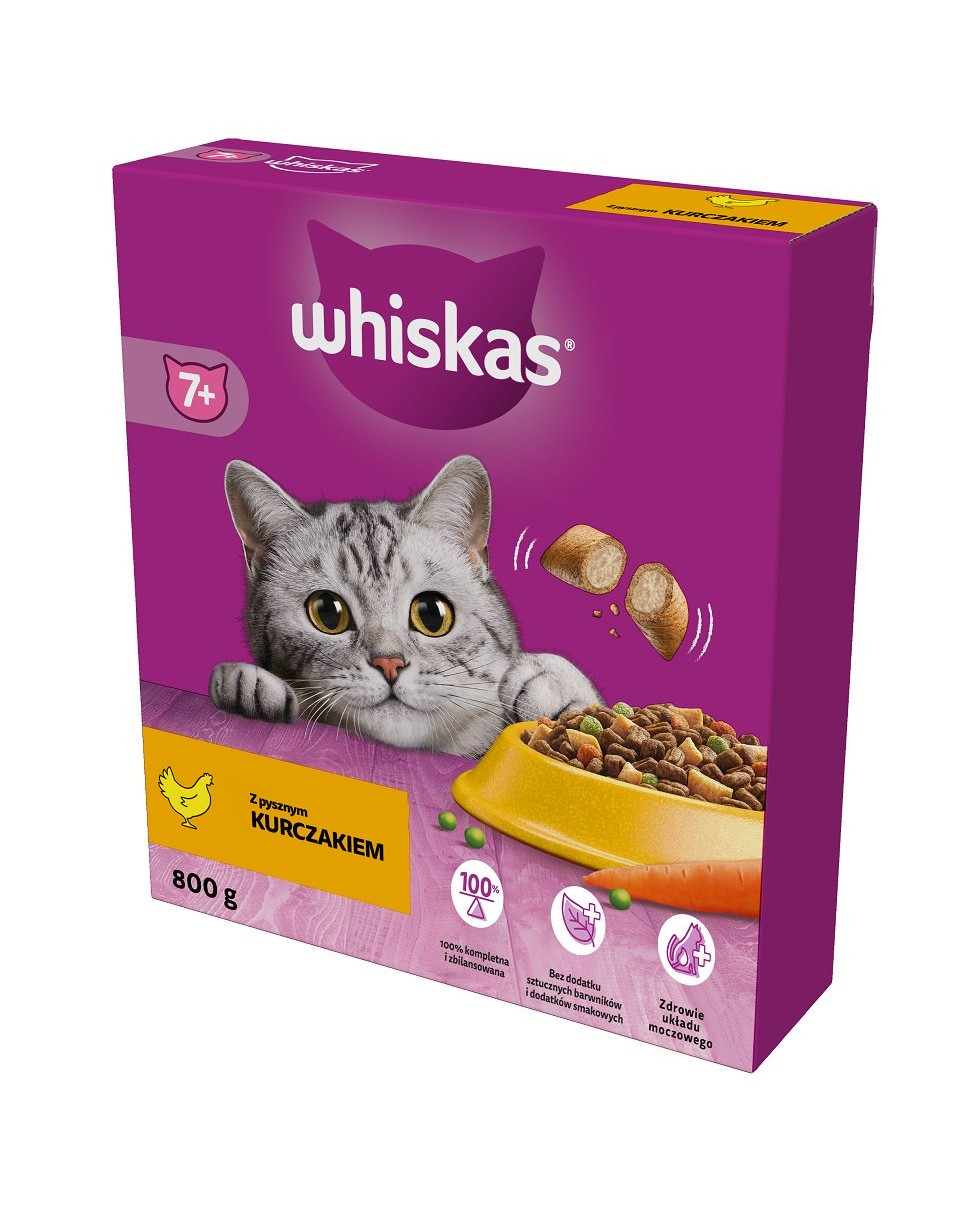 Whiskas met heerlijke kip is een compleet droogvoer voor katten vanaf 7 jaar. Het is een voer met korrels die van buiten knapperig zijn en van binnen een zachte vulling hebben, waar katten dol op zijn. Het granulaat met hoogwaardige eiwitten is zorgvuldig samengesteld om uw kattenvriend alles te geven wat hij nodig heeft om te spinnen. De volledige en uitgebalanceerde formule met gezonde en smakelijke groenten - wortelen en erwten - biedt de perfecte dosis voedingsstoffen om tegemoet te komen aan de veranderende behoeften van uw kat terwijl deze opgroeit. Dankzij het voer van Whiskas, dat met hoogwaardige ingrediënten van vertrouwde leveranciers wordt bereid, is uw kat gelukkig, gezond en kijkt elke keer weer uit naar het voer tijd.