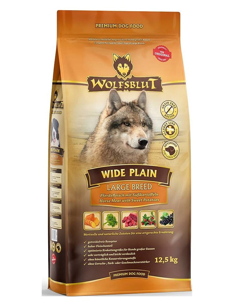 WOLFSBLUT WIDE PLAIN LARGE BREED is een compleet droogvoer voor volwassen honden met paardenvlees, waarin de oorspronkelijke voeding wordt gecombineerd met de moderne behoeften van uw hond. Zo kan uw hond elke dag genieten van een natuurlijke en passende voeding.