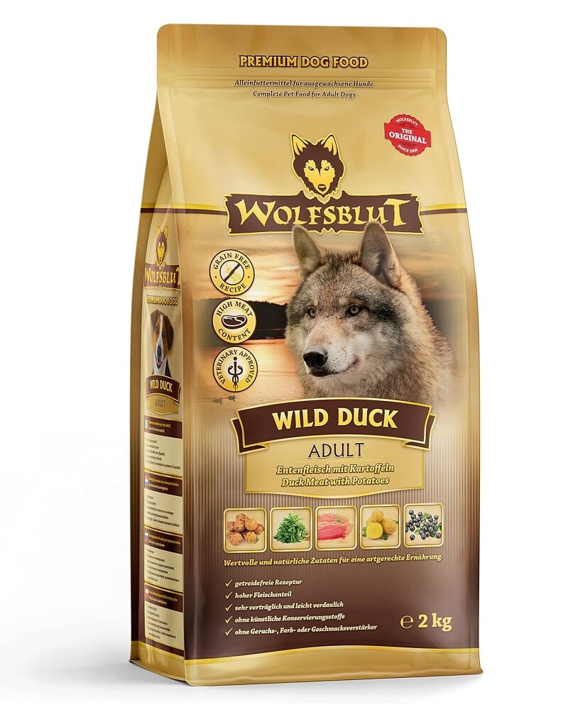 WOLFSBLUT WILD DUCK ADULT is een complete droge voeding voor volwassen honden met wilde eend, waarin de oorspronkelijke voeding wordt gecombineerd met de moderne behoeften van uw hond. Zo kan uw hond elke dag genieten van een natuurlijke en passende voeding.